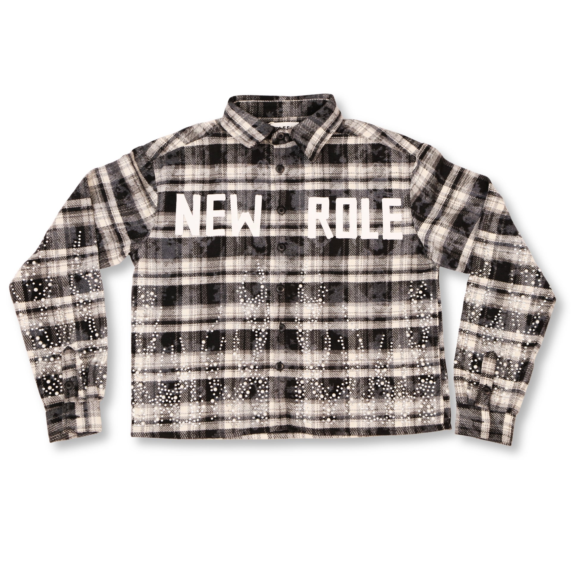 Front chest “NEW ROLE” print + clear crystal stud detail